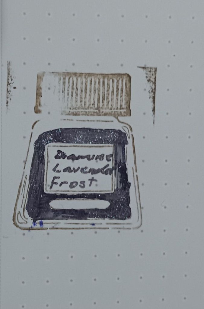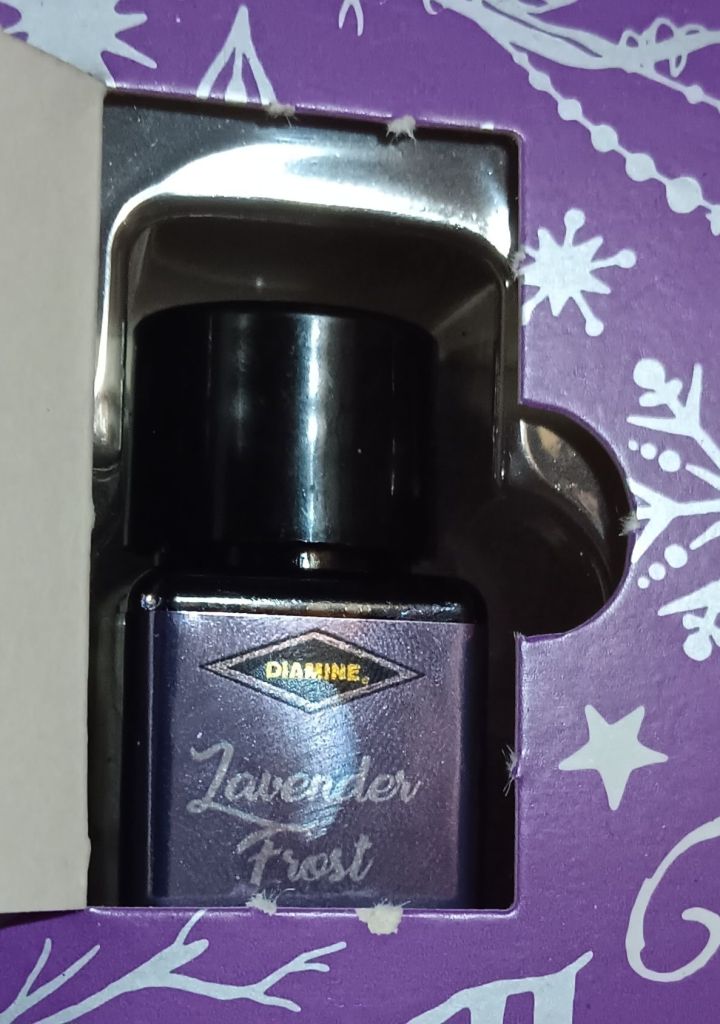 Today’s ink is called Lavender Frost. This is almost more of a grey than purple, but it is definitely a purple ink with multicolored shimmer in it. I think that the shimmer really adds a nice touch to it. I really liked this ink, and decided to ink it up right away. I decided to put it in my Lilac LAMY AL-Star with a fine nib. So far I am really happpy with this combination. I don’t think I have any ink quite like this one.